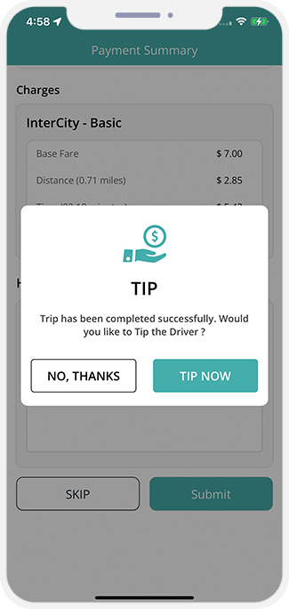 - If the User Tip's Driver via Credit Card, he will need to enter the Tip amount and it will be processed from his Credit Card. The App Owner will not get any commission on the Tip amount. The Tip will be listed on invoice but no Tax or Commission will be levied on it.
