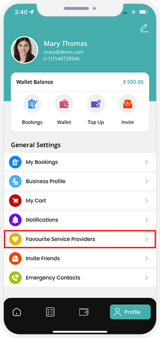 - Here the User is introduced to all the important features present in the App that include My Bookings, Favorite Provider, Wallet, Notifications, etc. to name a few.