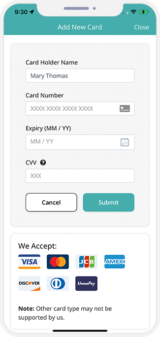 - Users & Drivers can manage their Credit Card information through this screen. The card detail is NOT stored in the APP or in the App's database. It's stored in the safe vault of the Payment Gateway Company. We just call the card using token and the secure transaction happens on the App.