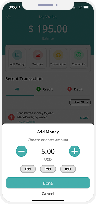 - Users and Drivers can top up their wallet too.
